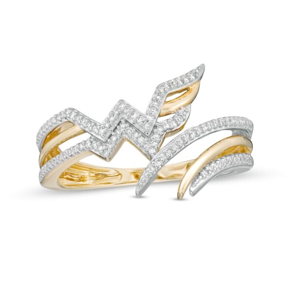 Crafted in warm 10K gold, this split-pronged ring features a subtle bypass design with a curved polished and diamond-lined ribbon. Featuring 1/8 carat diamonds with a dazzling polished luster, this ring is uniquely yours.