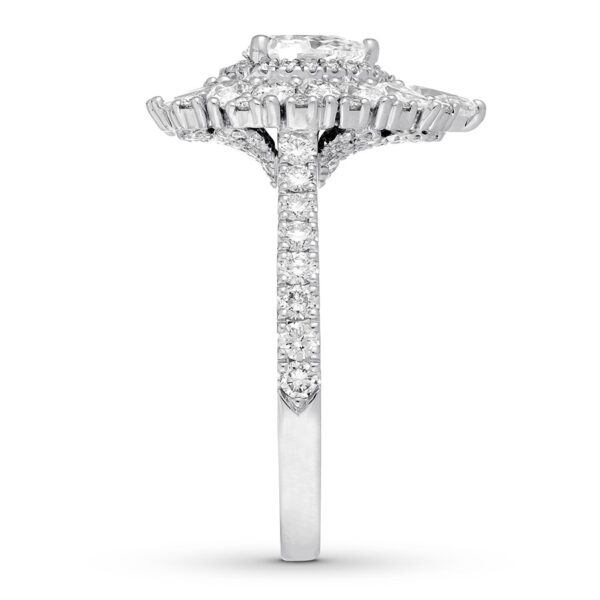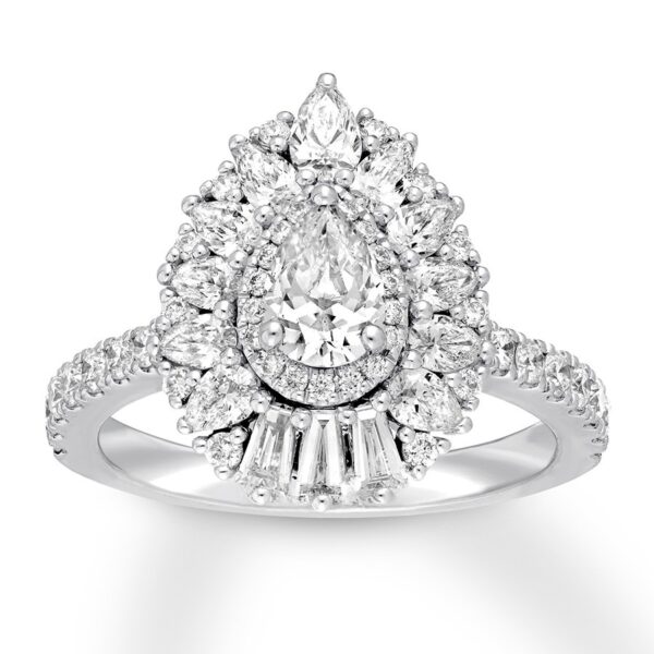 This breathtaking Neil Lane Studio engagement ring celebrates the glamour and elegance of the past. The dazzling center showcases a 1/2-carat pear-shaped diamond encircled by round diamonds. A burst of pear, round, and baguette diamonds completes the frame. Styled in polished 14K white gold, the ring has a total diamond weight of 1 7/8 carats.
